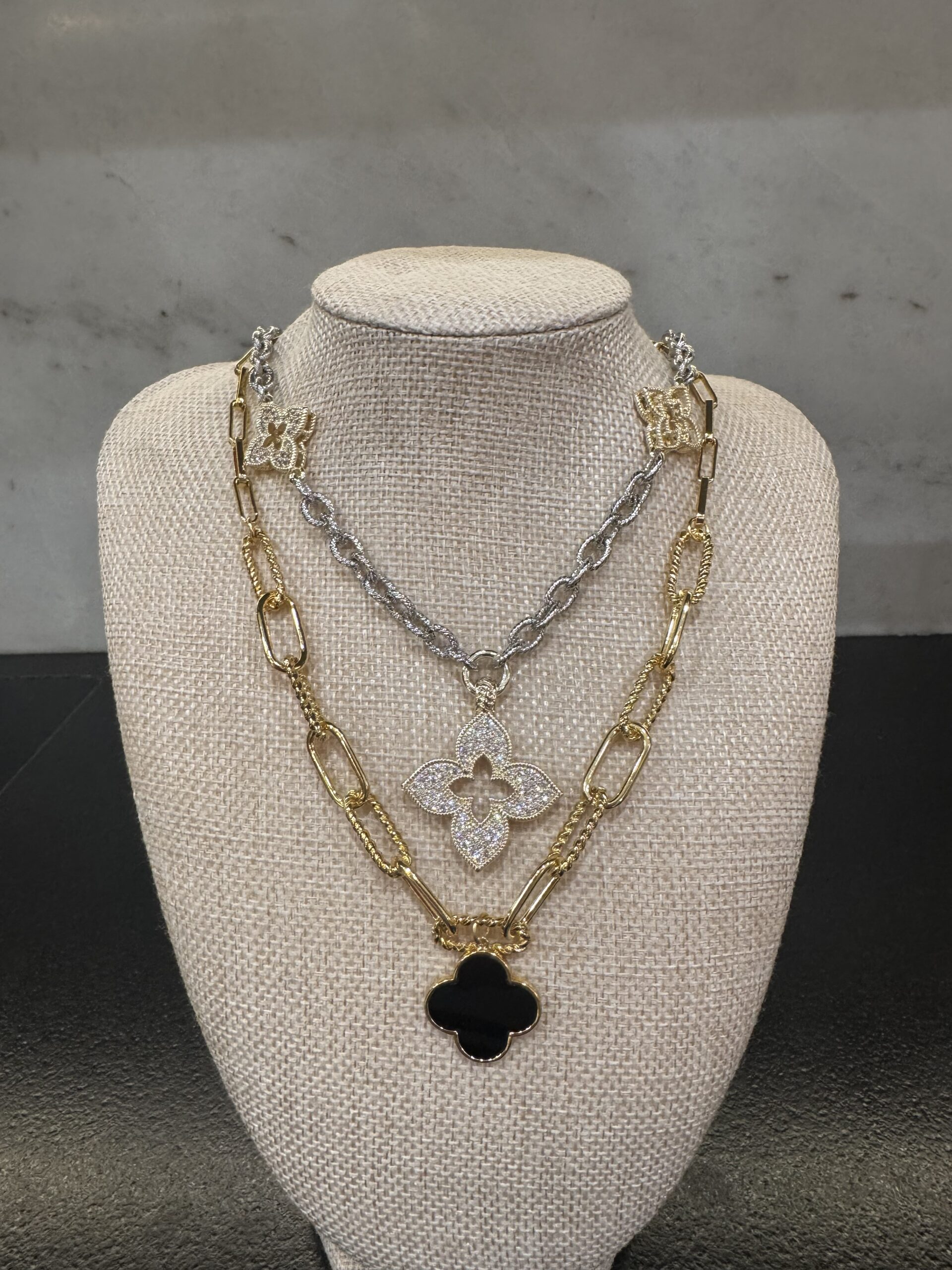 For an elevated layered moment, pair it with the Two-Toned Pavé Clover Necklace. The pavé detailing adds subtle sparkle, while the mix of gold and silver tones perfectly complements the black pendant, creating a refined, modern combination that stands out effortlessly.