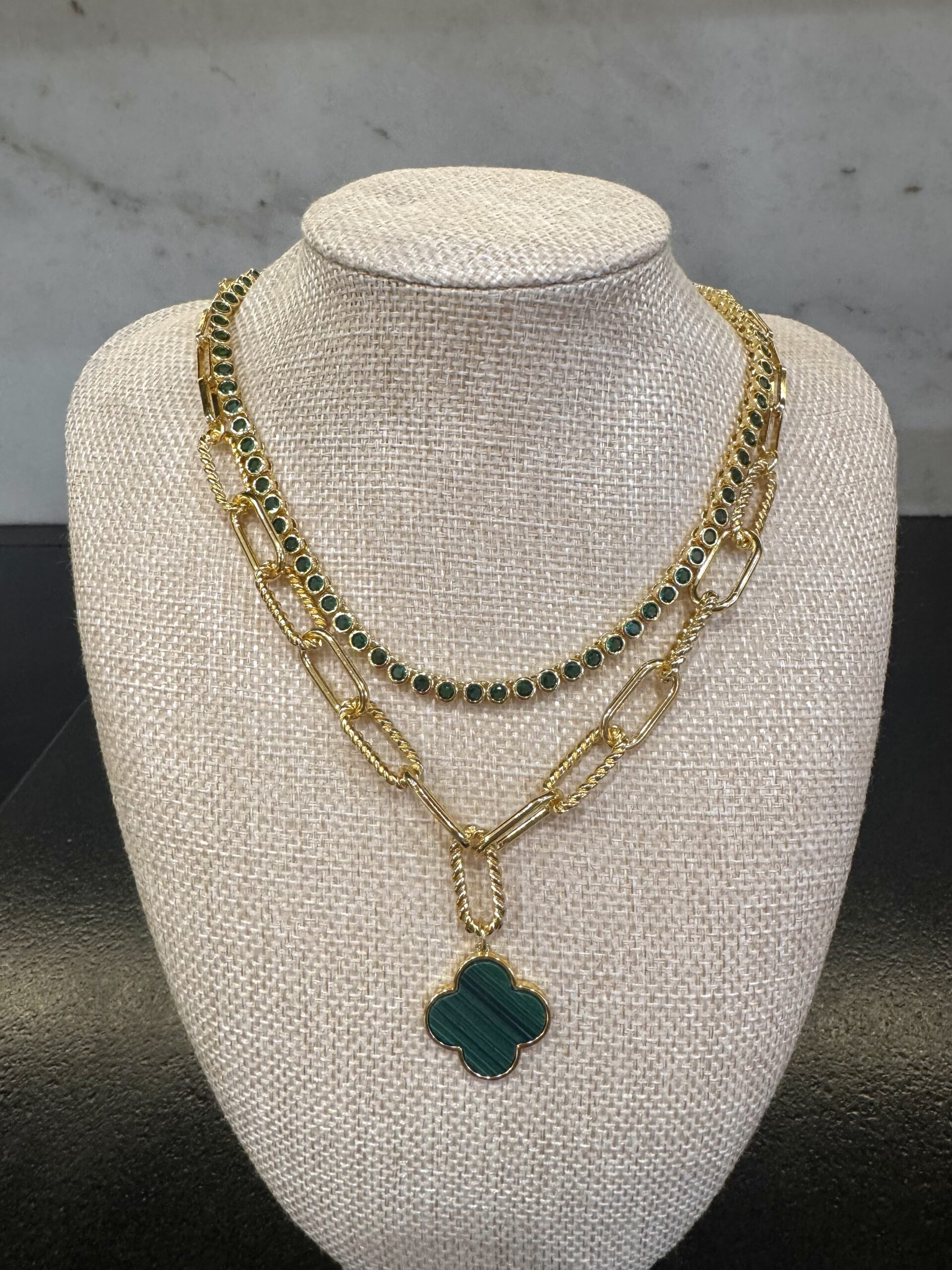 A polished take on everyday elegance. This necklace features a gold paperclip chain and a deep green clover pendant, a subtle statement that feels both timeless and contemporary. The bold links balance beautifully with the soft shape of the pendant, making it easy to dress up or down.